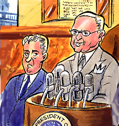 Pat Reynolds creates caricatures in a variety of styles: The first sample is a single scene that relates to one or more facets of the person's life, family, occupation, and/or hobby. The second sample depicts highlights of a person's career or life done as a comic strip. Here is another idea.. |